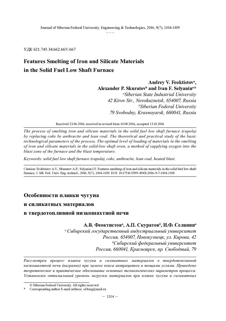Библиографическое описание:Феоктистов, А. В. Особенности плавки чугуна и силикатных материалов в твердотопливной низкошахтной печи = Features Smelting of Iron and Silicate Materials in the Solid Fuel Low Shaft Furnace / А. В. Феоктистов, А. П. Скуратов, И. Ф. Селянин. - Текст : непосредственный // Журнал Сибирского федерального университета. Техника и технологии. - 2016. - Т. 9, № 7. - С. 1104-1109 : рис. - Библиогр.: с. 1109. - ISSN 1999-494X.