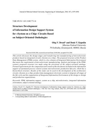 Аннотация:В статье рассматриваются этапы проектирования и передачи в производство изделий микроэлектроники на сверхбольших интегральных схемах класса «Система на кристалле». Предложена структура системы управления данными об изделиях (PDM-система), являющаяся ключевым элементом единого информационного пространства, отвечающего требованиям микроэлектронного производства.