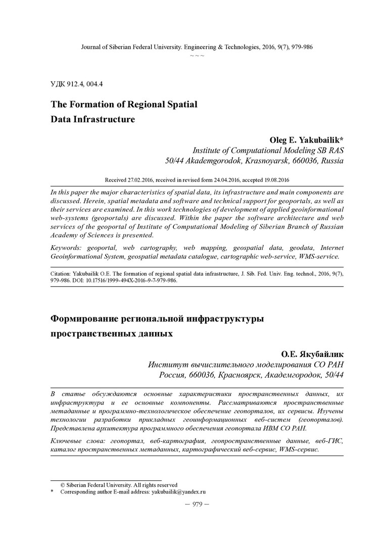 Библиографическое описание:Yakubailik, Oleg. The Formation of Regional Spatial Data Infrastructure = Формирование региональной инфраструктуры пространственных данных / O. E. Yakubailik. - Текст : непосредственный // Журнал Сибирского федерального университета. Техника и технологии. - 2016. - Т. 9, № 7. - С. 979-986 : рис. - Библиогр.: с. 985-986. - ISSN 1999-494X.