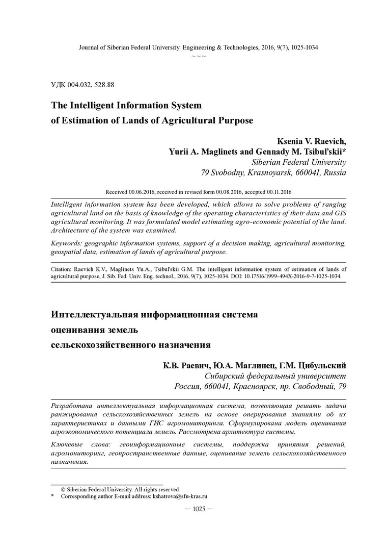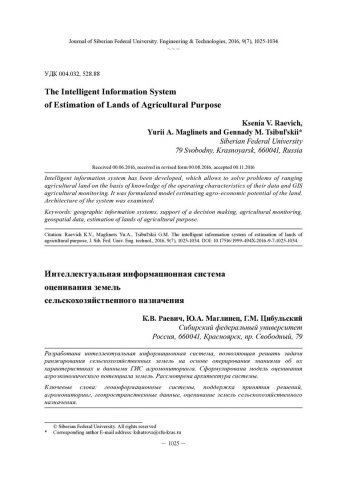 Аннотация:Разработана интеллектуальная информационная система, позволяющая решать задачи ранжирования сельскохозяйственных земель на основе оперирования знаниями об их характеристиках и данными ГИС агромониторинга. Сформулирована модель оценивания агроэкономического потенциала земель. Рассмотрена архитектура системы.