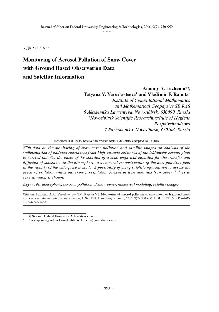 Библиографическое описание:Леженин, А. А. Мониторинг аэрозольного загрязнения снежного покрова на основе наземной и спутниковой информации = Monitoring of Aerosol Pollution of Snow Cover with Ground Based Observation Data and Satellite Information / А. А. Леженин, Т. В. Ярославцева, В. Ф. Рапута. - Текст : непосредственный // Журнал Сибирского федерального университета. Техника и технологии. - 2016. - Т. 9, № 7. - С. 950-959 : рис. - Библиогр.: с. 957-959. - ISSN 1999-494X.
