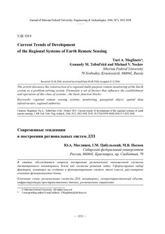 Библиографическое описание:Маглинец, Ю. А. Современные тенденции в построении региональных систем ДЗЗ = Current Trends of Development of the Regional Systems of Earth Remote Sensing / Ю. А. Маглинец, Г. М. Цибульский, М. В. Носков. - Текст : непосредственный // Журнал Сибирского федерального университета. Техника и технологии. - 2016. - Т. 9, № 7. - С. 1012-1018 : рис. - Библиогр.: с. 1017-1018. - ISSN 1999-494X.