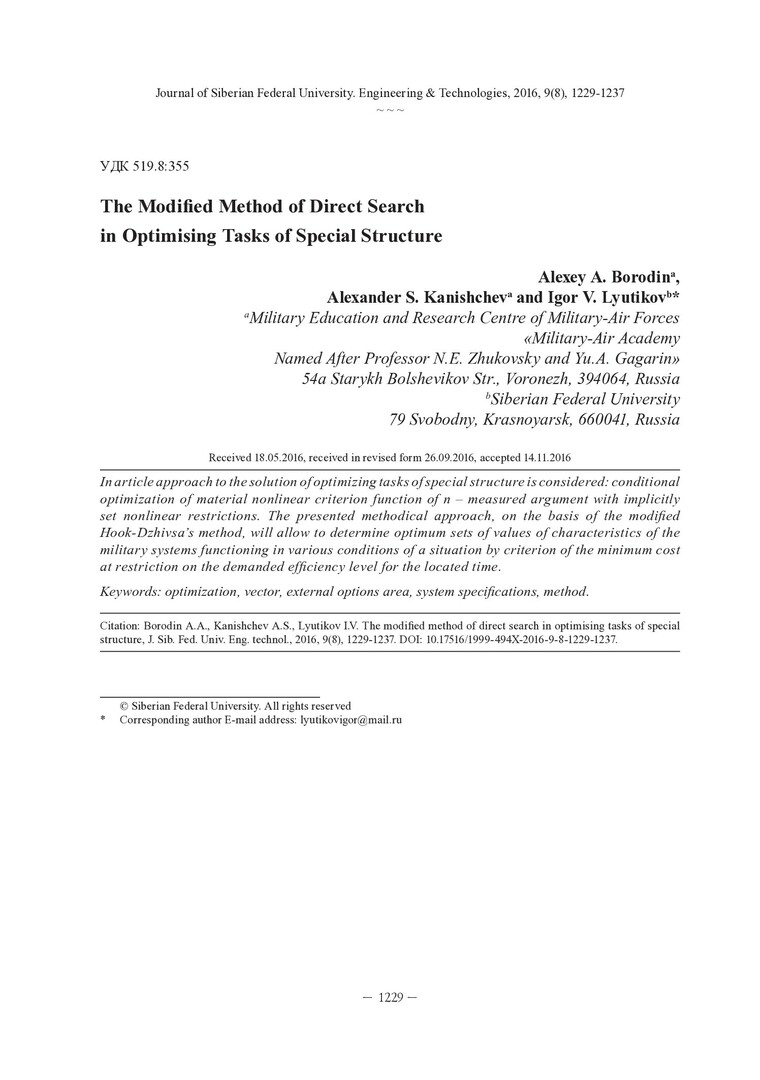 Аннотация:В статье рассмотрен подход к решению оптимизационных задач специальной структуры: условной оптимизации вещественной нелинейной целевой функции n-мерного аргумента с неявно заданными нелинейными ограничениями. Представленный методический подход на основе модифицированного метода Хука-Дживса позволит определить оптимальные наборы значений характеристик систем военного назначения, функционирующих в различных условиях обстановки, по критерию минимальной стоимости при ограничении на требуемый уровень эффективности за располагаемое время.