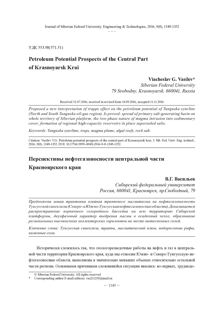 Библиографическое описание:Васильев, В. Г. Перспективы нефтегазоносности центральной части Красноярского края = Petroleum Potential Prospects of the Central Part of Krasnoyarsk Krai / В. Г. Васильев. - Текст : непосредственный // Журнал Сибирского федерального университета. Техника и технологии. - 2016. - Т. 9, № 8. - С. 1349-1352 : рис. - Библиогр.: с. 1352. - ISSN 1999-494X.