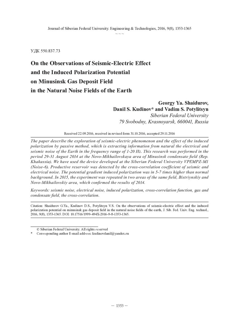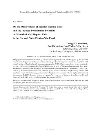 Библиографическое описание: Шайдуров, Г. Я. О наблюдении сейсмоэлектрического эффекта и потенциалов вызванной поляризации на Минусинском газоконденсатном месторождении в естественных шумовых полях Земли = On the Observations of Seismic-Electric Effect and the Induced Polarization Potential on Minusinsk Gas Deposit Field in the Natural Noise Fields of the Earth / Г. Я. Шайдуров, Д. С. Кудинов, В. С. Потылицын. - Текст : непосредственный // Журнал Сибирского федерального университета. Техника и технологии. - 2016. - Т. 9, № 8. - С. 1353-1365 : рис. - Библиогр.: с. 1363-1365. - ISSN 1999-494X.