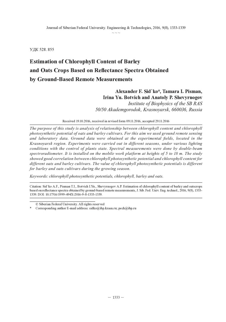 Библиографическое описание: Estimation of Chlorophyll Content of Barley and Oats Crops Based on Reflectance Spectra Obtained by Ground-Based Remote Measurements = Оценка содержания хлорофилла посевов ячменя и овса на основе спектров отражения при наземном дистанционном зондировании / A. F. Sid`ko, T. I. Pisman, I. Yu. Botvich, A. P. Shevyrnogov. - Текст : непосредственный // Журнал Сибирского федерального университета. Техника и технологии. - 2016. - Т. 9, № 8. - С. 1333-1339 : рис. - Библиогр.: с. 1338-1339. - ISSN 1999-494X.
