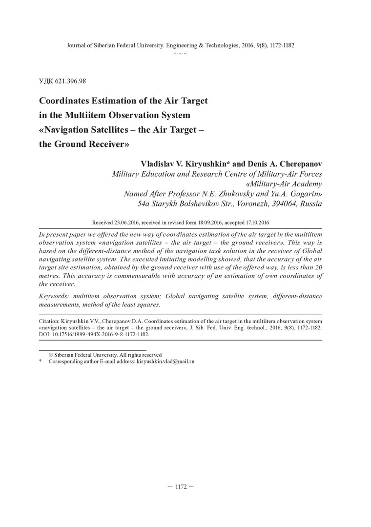 Библиографическое описание:Кирюшкин, В. В. Оценка координат воздушной цели в многопозиционной системе наблюдения «навигационные спутники – воздушная цель – наземный приемник» = Coordinates Estimation of the Air Target in the Multiitem Observation System «Navigation Satellites – the Air Target – the Ground Receiver» / В. В. Кирюшкин, Д. А. Черепанов. - Текст : непосредственный // Журнал Сибирского федерального университета. Техника и технологии. - 2016. - Т. 9, № 8. - С. 1172-1182 : рис. - Библиогр.: с. 1181-1182. - ISSN 1999-494X.
