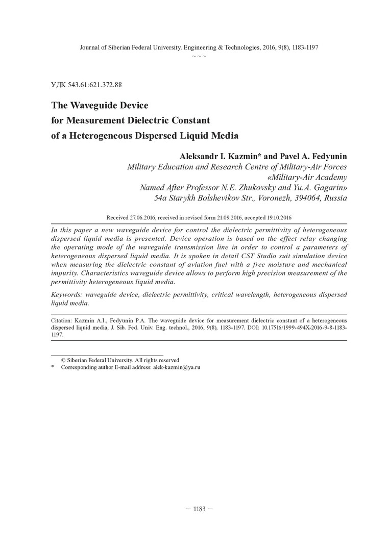 Библиографическое описание:Казьмин, А. И. Волноводные устройства контроля диэлектрической проницаемости авиационных дисперсных гетерогенных жидких сред = The Waveguide Device for Measurement Dielectric Constant of a Heterogeneous Dispersed Liquid Media / А. И. Казьмин, П. А. Федюнин. - Текст : непосредственный // Журнал Сибирского федерального университета. Техника и технологии. - 2016. - Т. 9, № 8. - С. 1183-1197 : рис. - Библиогр.: с. 1196-1197. - ISSN 1999-494X.