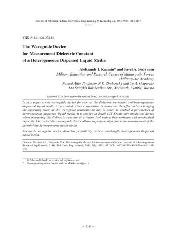 Аннотация:В статье представлено новое волноводное устройство для измерения диэлектрической проницаемости гетерогенных дисперсных жидких сред. Работа устройства основана на использовании эффекта релейной смены режима работы волноводной линии передачи в целях контроля параметров гетерогенных дисперсных жидких сред. Подробно описывается моделирование устройства в CST Studio suit при измерении диэлектрической проницаемости авиационного керосина со свободной влагой и механическими примесями. Характеристики волноводного устройства позволяют проводить высокоточные измерения диэлектрической проницаемости гетерогенных жидких сред.