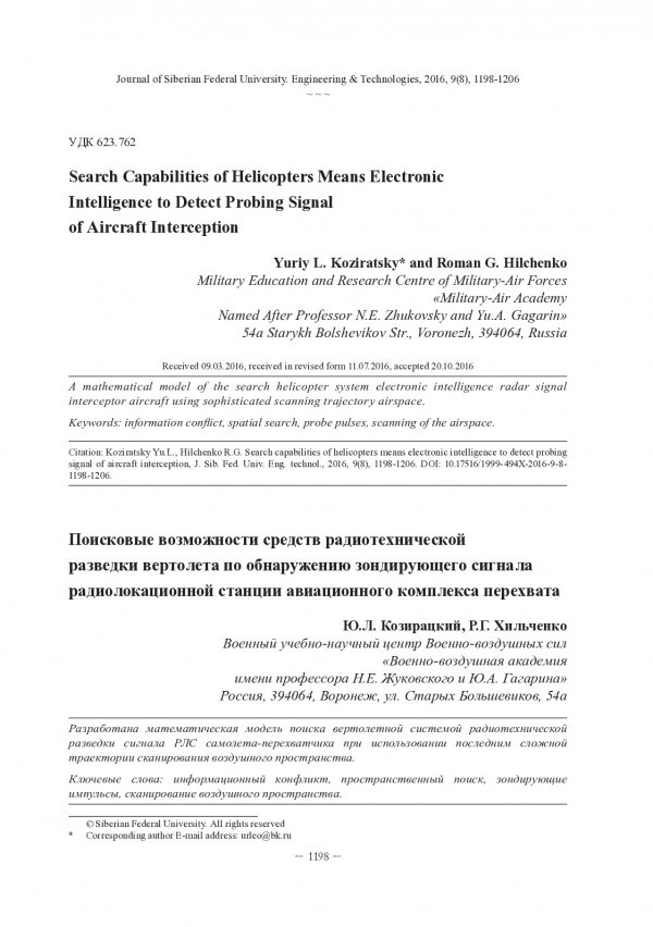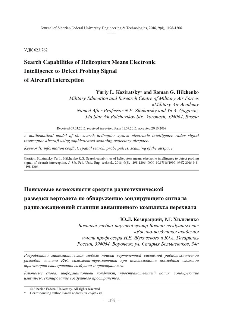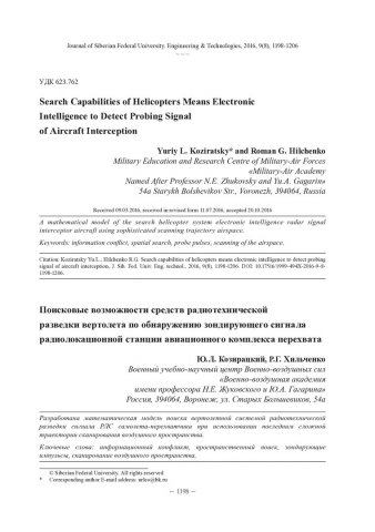 Библиографическое описание:Козирацкий, Ю. Л. Поисковые возможности средств радиотехнической разведки вертолета по обнаружению зондирующего сигнала радиолокационной станции авиационного комплекса перехвата = Search Capabilities of Helicopters Means Electronic Intelligence to Detect Probing Signal of Aircraft Interception / Ю. Л. Козирацкий, Р. Г. Хильченко. - Текст : непосредственный // Журнал Сибирского федерального университета. Техника и технологии. - 2016. - Т. 9, № 8. - С. 1198-1206 : рис. - Библиогр.: с. 1206. - ISSN 1999-494X.