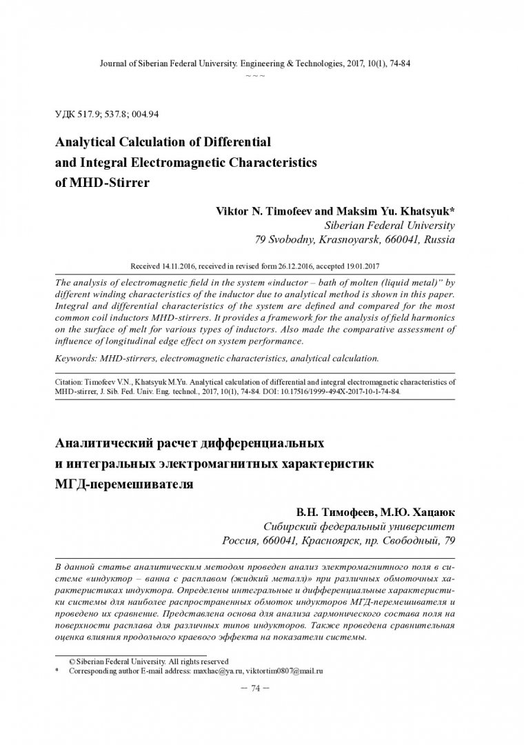 Библиографическое описание:Тимофеев, В. Н. Аналитический расчет дифференциальных и интегральных электромагнитных характеристик МГД - перемешивателя = Analytical Calculation of Differential and Integral Electromagnetic Characteristics of MHD-Stirrer / В. Н. Тимофеев, М. Ю. Хацаюк. - Текст : непосредственный // Журнал Сибирского федерального университета. Техника и технологии. - 2017. - Т. 10, № 1. - С. 74-84 : рис. - Библиогр.: с. 84. - ISSN 1999-494X.