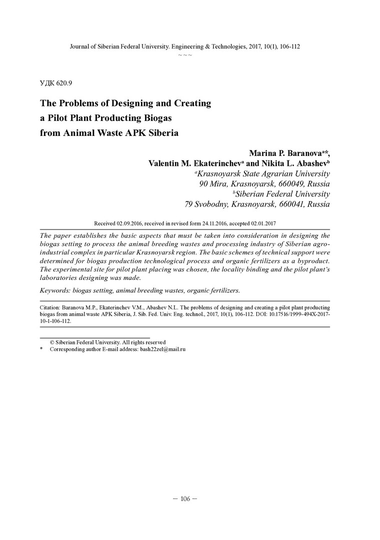 Библиографическое описание:Баранова, М. П. Проблемы проектирования и создания опытно-промышленной установки получения биогаза из отходов животноводства АПК Сибири = The Problems of Designing and Creating a Pilot Plant Producting Biogas from Animal Waste APK Siberia / М. П. Баранова, В. М. Екатеринчев, Н. Л. Абашев. - Текст : непосредственный // Журнал Сибирского федерального университета. Техника и технологии. - 2017. - Т. 10, № 1. - С. 106-112 : рис. - Библиогр.: с. 111-112. - ISSN 1999-494X.