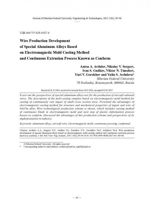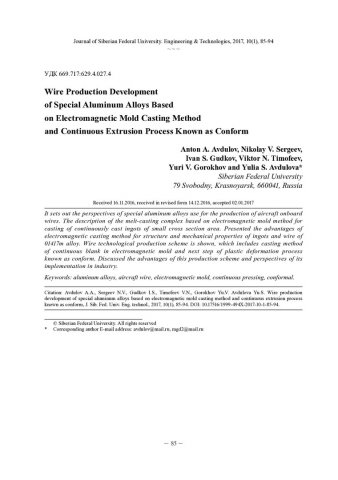 Разработка технологии производства проволоки из специальных алюминиевых сплавов на основе способа литья в электромагнитный кристаллизатор и непрерывного прессования способом конформ