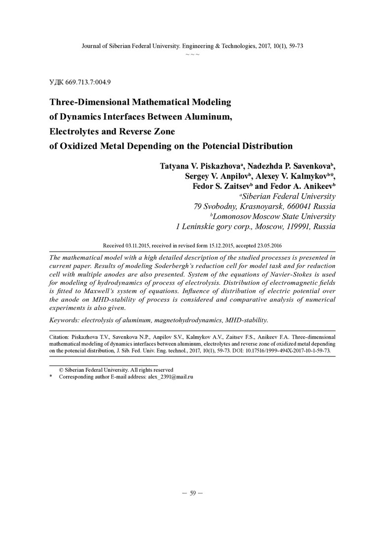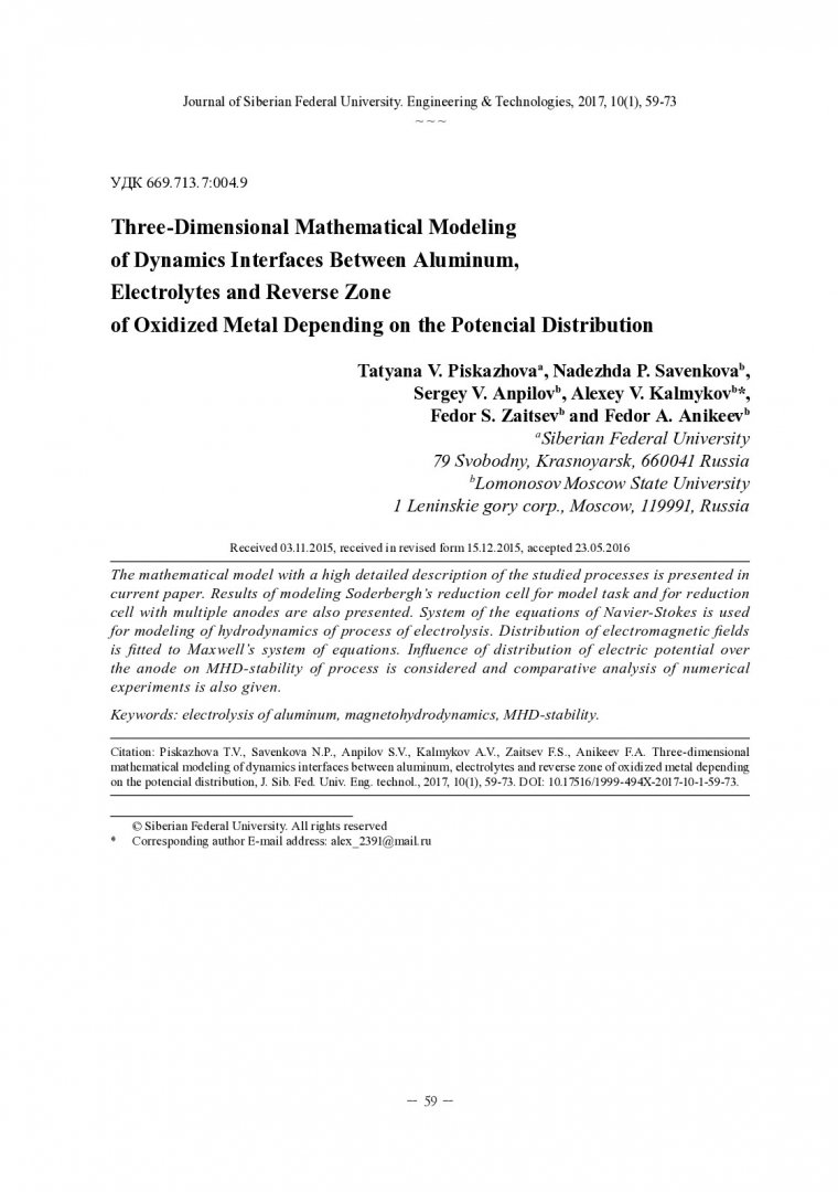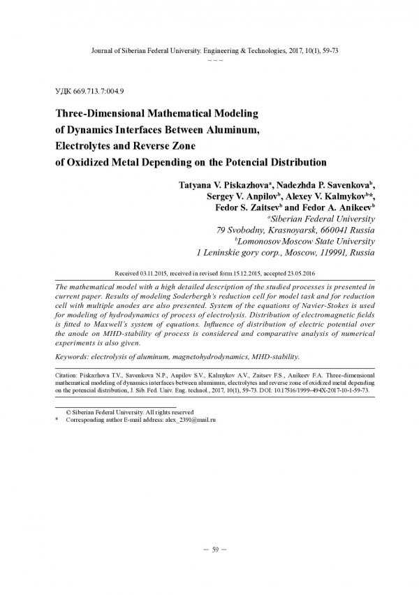 Библиографическое описание:Трёхмерное математическое моделирование динамики границы раздела сред алюминия, электролита и зоны обратного окисления металла в зависимости от распределения потенциала = Three-Dimensional Mathematical Modeling of Dynamics Interfaces Between Aluminum, Electrolytes and Reverse Zone of Oxidized Metal Depending on the Potencial Distribution / Т. В. Пискажова, Н. П. Савенкова, С. В. Анпилов [и др.]. - Текст : непосредственный // Журнал Сибирского федерального университета. Техника и технологии. - 2017. - Т. 10, № 1. - С. 59-73 : рис. - Библиогр.: с. 73. - ISSN 1999-494X.