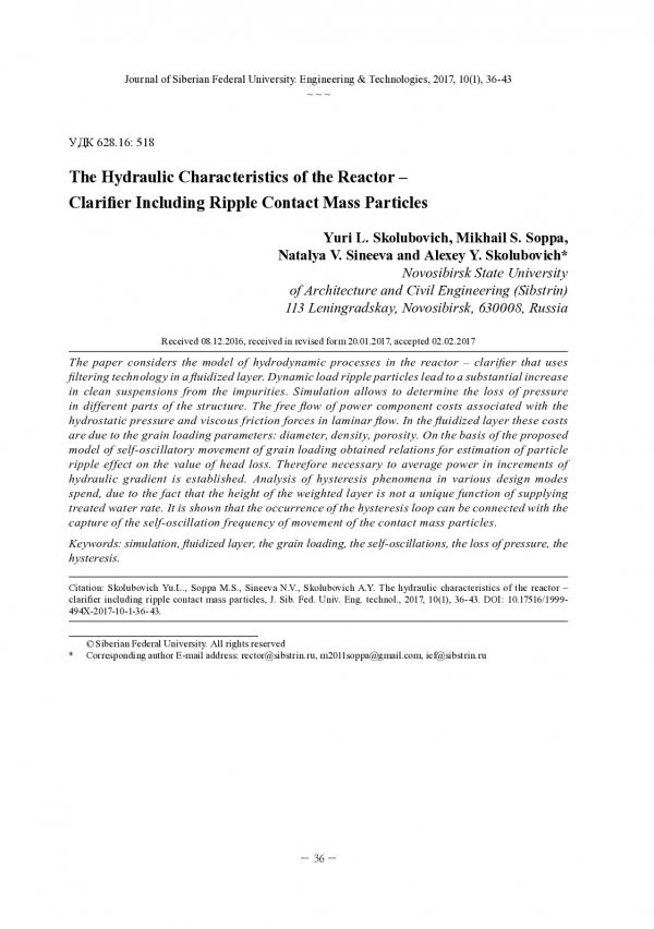 Библиографическое описание: Гидравлические характеристики реактора-осветлителя с учетом пульсаций частиц контактной массы = The Hydraulic Characteristics of the Reactor – Clarifier Including Ripple Contact Mass Particles / Ю. Л. Сколубович, М. С. Соппа, Синеева, А. Ю. Сколубович. - Текст : непосредственный // Журнал Сибирского федерального университета. Техника и технологии. - 2017. - Т. 10, № 1. - С. 36-43 : рис. - Библиогр.: с. 43. - ISSN 1999-494X.