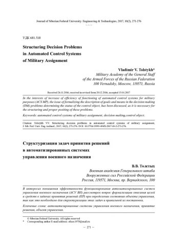 Библиографическое описание:Толстых, В. В. Cтруктуризация задач принятия решений в автоматизированных системах управления военного назначения = Structuring Decision Problems in Automated Control Systems of Military Assignment / В. В. Толстых. - Текст : непосредственный // Журнал Сибирского федерального университета. Техника и технологии. - 2017. - Т. 10, № 2. - С. 271-276 : рис. - Библиогр.: с. 276. - ISSN 1999-494X.