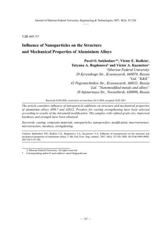 Библиографическое описание:Влияние наночастиц на структуру и механические свойства алюминиевых сплавов / П. О. Суходаев, В. Е. Редькин, Т. А. Богданова, В. А. Кузнецов. - Текст : непосредственный // Журнал Сибирского федерального университета. Техника и технологии. - 2017. - Т. 10, № 3. - С. 317-326 : рис. - Библиогр.: с. 326. - ISSN 1999-494X.