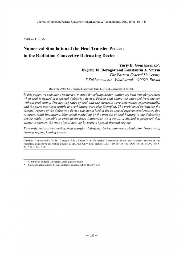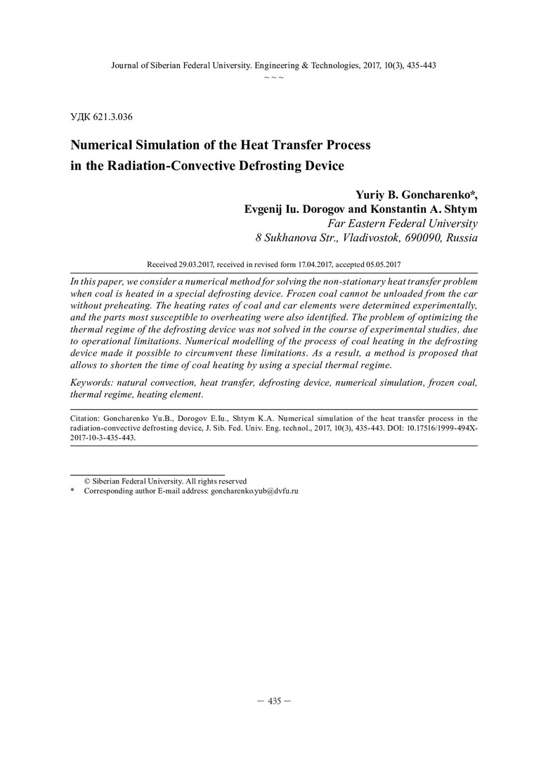 Библиографическое описание: Гончаренко, Ю. Б. Численное моделирование процесса теплопередачи в радиационно-конвективном размораживающем устройстве / Ю. Б. Гончаренко, Е. Ю. Дорогов, К. А. Штым. - Текст : непосредственный // Журнал Сибирского федерального университета. Техника и технологии. - 2017. - Т. 10, № 3. - С. 435-443 : рис. - Библиогр.: с. 442-443. - ISSN 1999-494X.