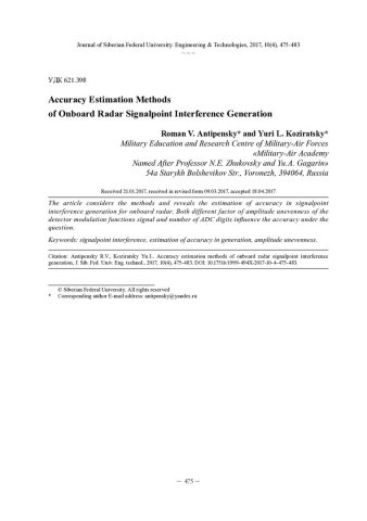Библиографическое описание:Антипенский, Р. В. Методика оценки точности формирования сигналоподобных помех бортовым радиолокационным станциям / Р. В. Антипенский, Ю. Л. Козирацкий. - Текст : непосредственный // Журнал Сибирского федерального университета. Техника и технологии. - 2017. - Т. 10, № 4. - С. 475-483 : рис. - Библиогр.: с. 483. - ISSN 1999-494X.