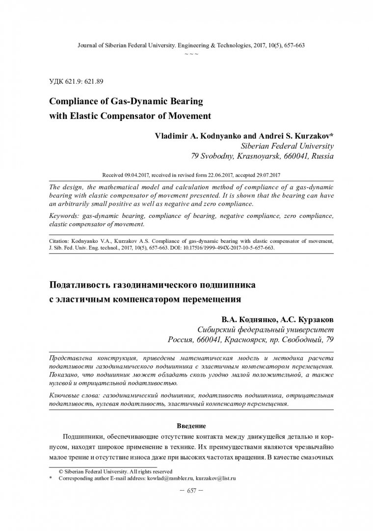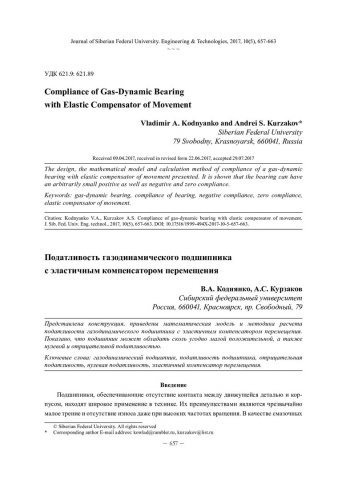 Библиографическое описание:Коднянко, В. А. Податливость газодинамического подшипника с эластичным компенсатором перемещения / В. А. Коднянко, А. С. Курзаков. - Текст : непосредственный // Журнал Сибирского федерального университета. Техника и технологии. - 2017. - Т. 10, № 5. - С. 657-663 : рис. - Библиогр.: с. 663. - ISSN 1999-494X.