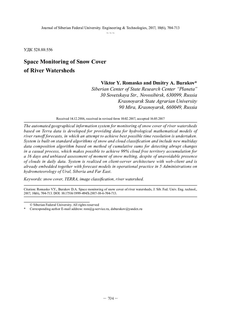 Библиографическое описание: Ромасько, В. Ю. Космический мониторинг заснеженности территории речных бассейнов / В. Ю. Ромасько, Д. А. Бураков. - Текст : непосредственный // Журнал Сибирского федерального университета. Техника и технологии. - 2017. - Т. 10, № 6. - С. 704-713 : рис. - Библиогр.: с. 712-713. - ISSN 1999-494X.