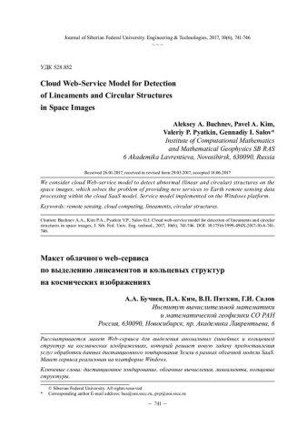 Аннотация:Рассматривается макет Web-сервиса для выделения аномальных (линейных и кольцевых) структур на космических изображениях, который решает новую задачу предоставления услуг обработки данных дистанционного зондирования Земли в рамках облачной модели SaaS. Макет сервиса реализован на платформе Windows.
