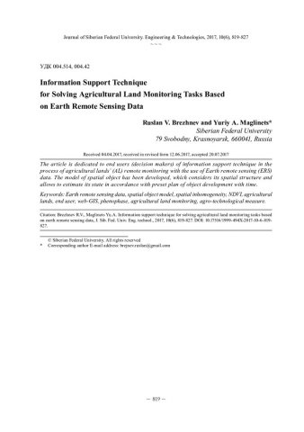Библиографическое описание:Brezhnev, Ruslan V... Information Support Technique for Solving Agricultural Land Monitoring Tasks Based on Earth Remote Sensing Data = Методика информационной поддержки решения задач агромониторинга по данным дистанционного зондирования Земли / R. V. Brezhnev, Y. A. Maglinets. - Текст : непосредственный // Журнал Сибирского федерального университета. Техника и технологии. - 2017. - Т. 10, № 6. - С. 819-827 : рис. - Библиогр.: с. 826-827. - ISSN 1999-494X.