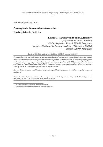 Библиографическое описание:Свердлик, Л. Г. Аномалии температуры атмосферы в периоды сейсмической активности / Л. Г. Свердлик, С. А. Имашев. - Текст : непосредственный // Журнал Сибирского федерального университета. Техника и технологии. - 2017. - Т. 10, № 6. - С. 783-793 : рис. - Библиогр.: с. 792-793. - ISSN 1999-494X.