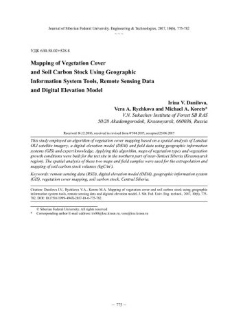 Библиографическое описание:Danilova, Irina V... Mapping of Vegetation Cover and Soil Carbon Stock Using Geographic Information System Tools, Remote Sensing Data and Digiatal Elevation Model = Картографирование растительного покрова и запасов углерода в почве с использованием ГИС, данных дистанционного зондирования и цифровой модели рельефа / I. V. Danilova, V. A. Ryzhkova, M. A. Korets. - Текст : непосредственный // Журнал Сибирского федерального университета. Техника и технологии. - 2017. - Т. 10, № 6. - С. 775-782 : рис. - Библиогр.: с. 781-782. - ISSN 1999-494X.
