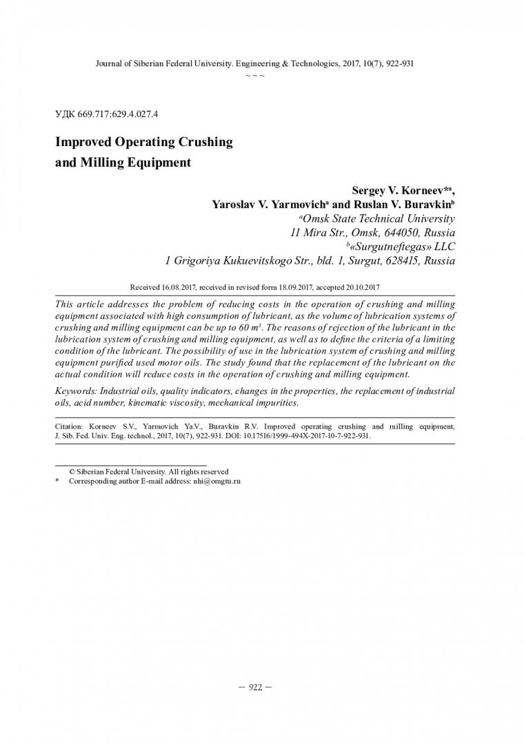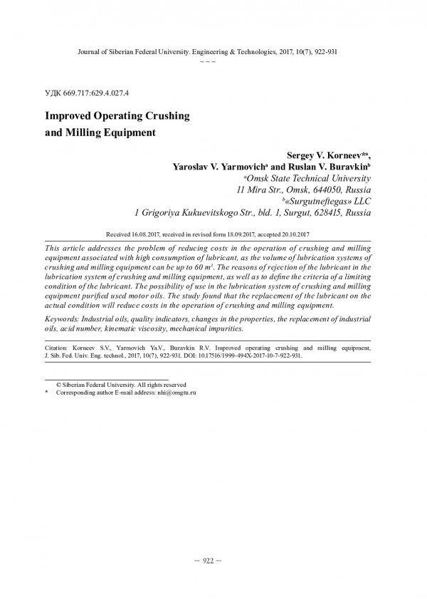 Библиографическое описание: Корнеев, С. В. Совершенствование эксплуатации дробильно-размольного оборудования / С. В. Корнеев, Я. В. Ярмович, Р. В. Буравкин. - Текст : непосредственный // Журнал Сибирского федерального университета. Техника и технологии. - 2017. - Т. 10, № 7. - С. 922-931 : рис. - Библиогр.: с. 930-931. - ISSN 1999-494X.