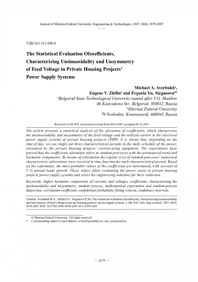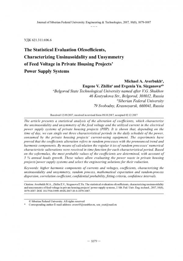 Библиографическое описание: Авербух, М. А. Статистическая оценка коэффициентов, характеризующих несинусоидальность и несимметрию питающего напряжения в системах электроснабжения ИЖС / М. А. Авербух, Е. В. Жилин, Е. Ю. Сизганова. - Текст : непосредственный // Журнал Сибирского федерального университета. Техника и технологии. - 2017. - Т. 10, № 8. - С. 1079-1087 : рис. - Библиогр.: с. 1087. - ISSN 1999-494X.