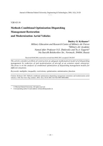 Библиографическое описание:Крикунов, Д. О. Методы условной оптимизации диспетчерского управления восстановлением и модернизацией летательных аппаратов = Methods Conditional Optimization Dispatching Management Restoration and Modernization Aerial Vehicles / Д. О. Крикунов. - Текст : непосредственный // Журнал Сибирского федерального университета. Техника и технологии. - 2018. - Т. 11, № 1. - С. 24-28 : рис. - Библиогр.: с. 28. - ISSN 1999-494X.