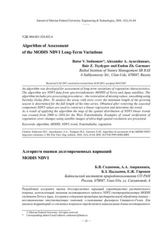 Библиографическое описание: Алгоритм оценки долговременных вариаций MODIS NDVI = Algorithm of Assessment of the MODIS NDVI Long-Term Variations / Б. В. Содномов [и др.]. - Текст : непосредственный // Журнал Сибирского федерального университета. Техника и технологии. - 2018. - Т. 11, № 1. - С. 61-68 : рис. - Библиогр.: с. 68. - ISSN 1999-494X.