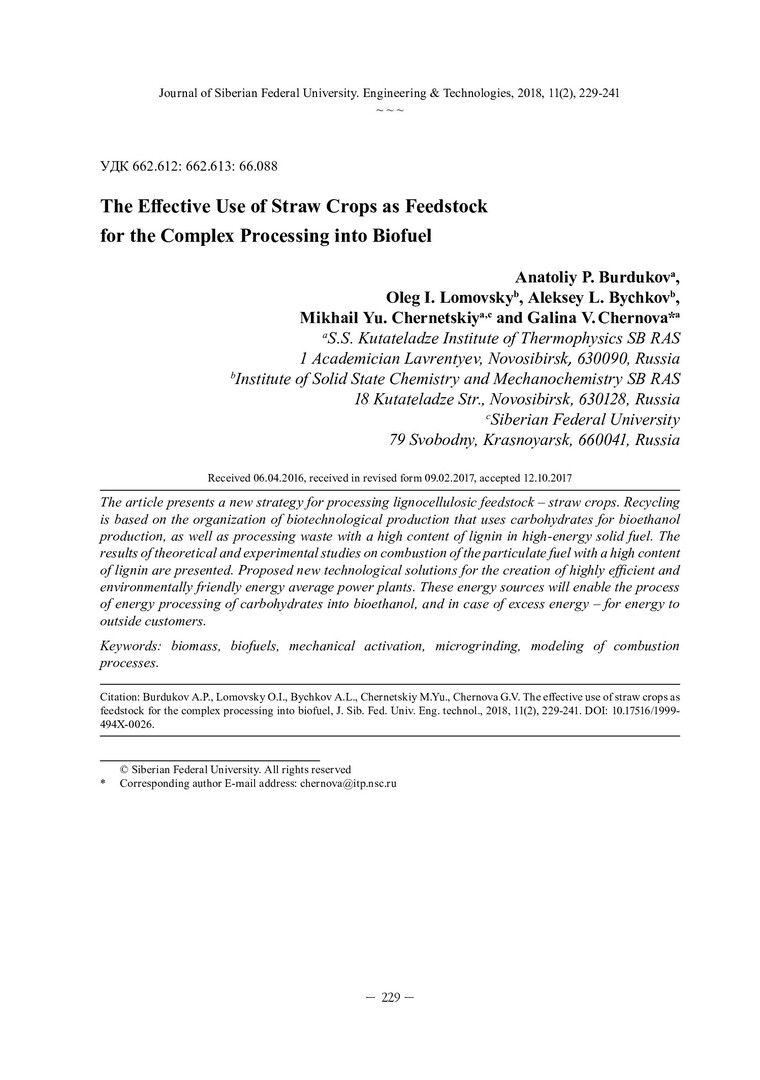 Библиографическое описание: Эффективное использование соломы зерновых культур в качестве сырья для комплексной переработки в биотопливо = The Effective Use of Straw Crops as Feedstock for the Complex Processing into Biofuel / А. П. Бурдуков [и др.]. - Текст : непосредственный // Журнал Сибирского федерального университета. Техника и технологии. - 2018. - Т. 11, № 2. - С. 229-241 : рис. - Библиогр.: с. 240-241. - ISSN 1999-494X.