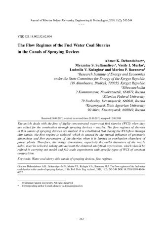 Библиографическое описание: Режимы течения топливных водоугольных суспензий в каналах распыливающих устройств = The Flow Regimes of the Fuel Water Coal Slurries in the Canals of Spraying Devices / А. К. Джундубаев [и др.]. - Текст : непосредственный // Журнал Сибирского федерального университета. Техника и технологии. - 2018. - Т. 11, № 2. - С. 242-249 : рис. - Библиогр.: с. 248-249. - ISSN 1999-494X.