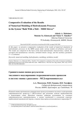 Аннотация:В данной статье представлена сравнительная оценка результатов численного моделирования гидродинамических процессов в МГД - системе при различных моделях турбулентности и детализациях сетки. Проведено взаимное сравнение результатов по основным гидродинамическим характеристикам, а именно осредненной и мгновенной скорости, турбулентной кинетической энергии, а также дана оценка вспомогательного параметра Y+.