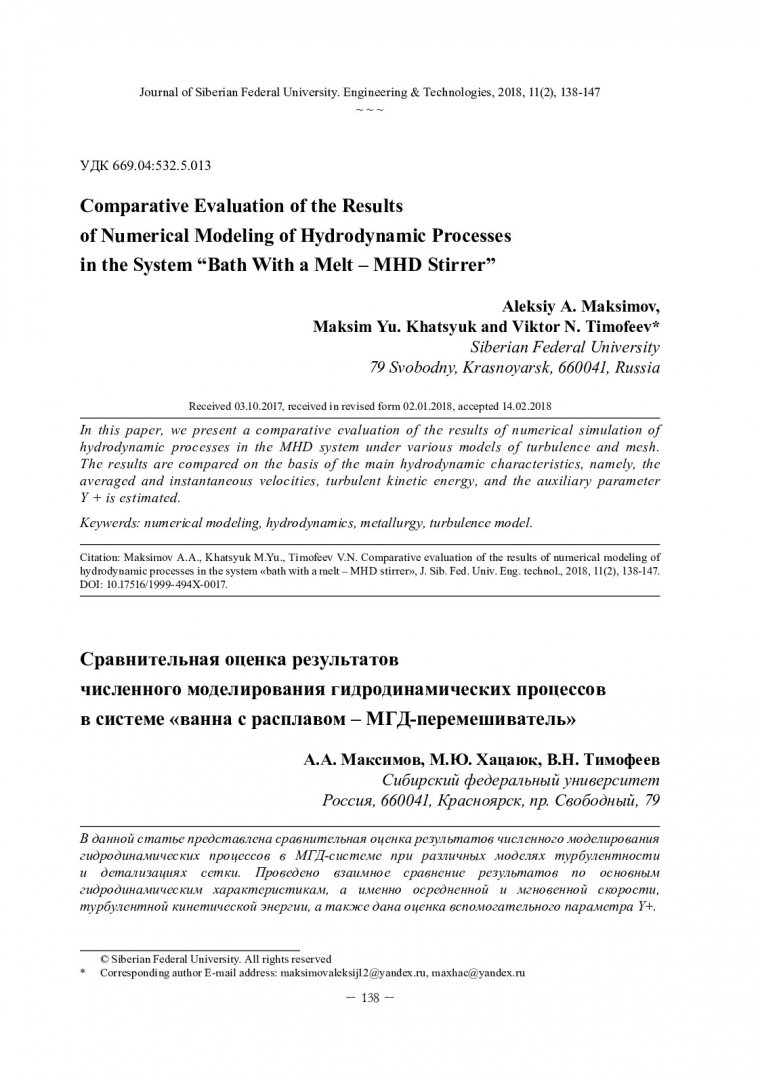 Библиографическое описание:Максимов, А. А. Сравнительная оценка результатов численного моделирования гидродинамических процессов в системе «ванна с расплавом – МГД - перемешиватель» = Comparative Evaluation of the Results of Numerical Modeling of Hydrodynamic Processes in the System “Bath With a Melt – MHD Stirrer” / А. А. Максимов, М. Ю. Хацаюк, В. Н. Тимофеев. - Текст : непосредственный // Журнал Сибирского федерального университета. Техника и технологии. - 2018. - Т. 11, № 2. - С. 138-147 : рис. - Библиогр.: с. 146-147. - ISSN 1999-494X.
