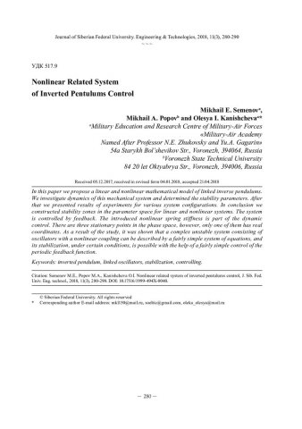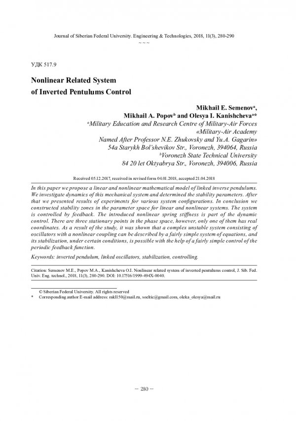 Библиографическое описание: Семёнов, М. Е. Управление системой нелинейно связанных перевернутых маятников = Nonlinear Related System of Inverted Pentulums Control / М. Е. Семёнов, М. А. Попов, О. И. Канищева. - Текст : непосредственный // Журнал Сибирского федерального университета. Техника и технологии. - 2018. - Т. 11, № 3. - С. 280-290 : рис. - Библиогр.: с. 289-290. - ISSN 1999-494X.