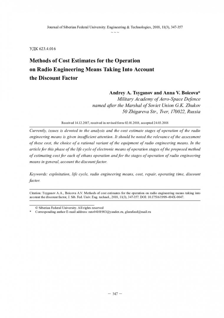 Библиографическое описание:Цыганов, А. А. Методика оценки затрат на эксплуатацию радиотехнического средства с учетом коэффициента дисконтирования = Methods of Cost Estimates for the Operation on Radio Engineering Means Taking Into Account the Discount Factor / А. А. Цыганов, А. В. Бойкова. - Текст : непосредственный // Журнал Сибирского федерального университета. Техника и технологии. - 2018. - Т. 11, № 3. - С. 347-357 : рис. - Библиогр.: с. 357. - ISSN 1999-494X.