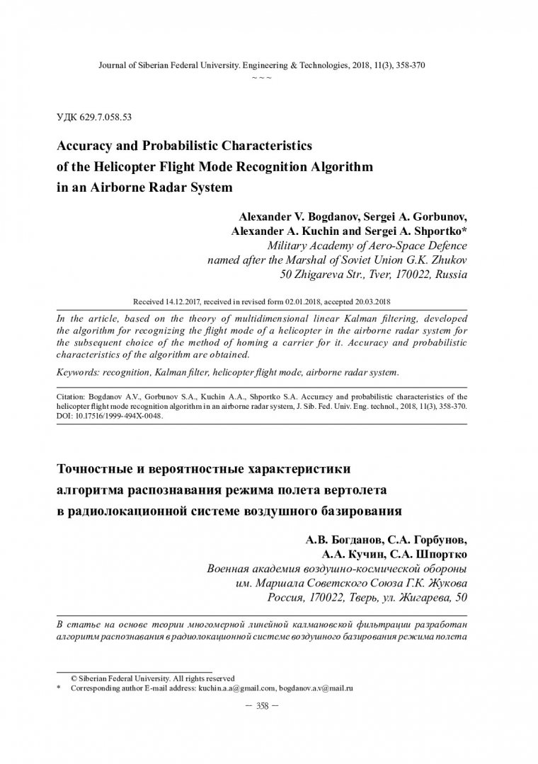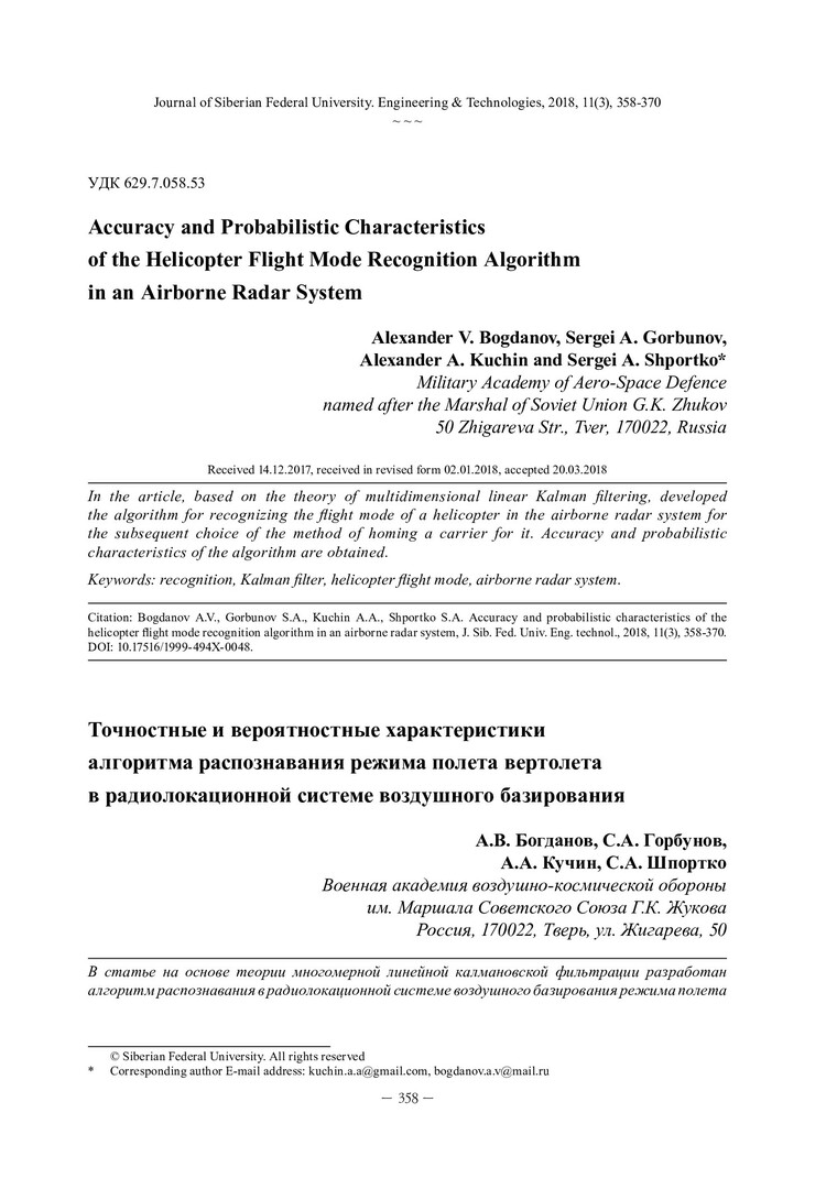 Библиографическое описание:Точностные и вероятностные характеристики алгоритма распознавания режима полета вертолета в радиолокационной системе воздушного базирования = Accuracy and Probabilistic Characteristics of the Helicopter Flight Mode Recognition Algorithm in an Airborne Radar System / А. В. Богданов [и др.]. - Текст : непосредственный // Журнал Сибирского федерального университета. Техника и технологии. - 2018. - Т. 11, № 3. - С. 358-370 : рис. - Библиогр.: с. 369-370. - ISSN 1999-494X.