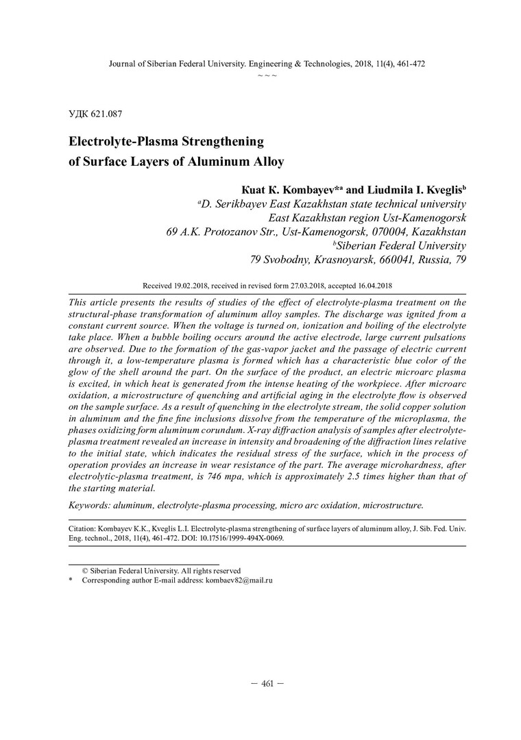 Библиографическое описание:Комбаев, К. К. Электролитно-плазменное упрочнение поверхностных слоев алюминиевого сплава = Electrolyte-Plasma Strengthening of Surface Layers of Aluminum Alloy / К. К. Комбаев, Л. И. Квеглис. - Текст : непосредственный // Журнал Сибирского федерального университета. Техника и технологии. - 2018. - Т. 11, № 4. - С. 461-472 : рис. - Библиогр.: с. 469-472. - ISSN 1999-494X.