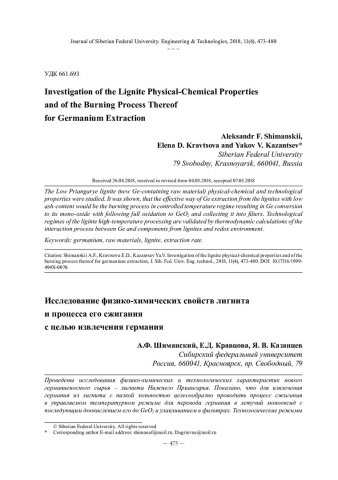 Библиографическое описание:Шиманский, А. Ф. Исследование физико-химических свойств лигнита и процесса его сжигания с целью извлечения германия = Investigation of the Lignite Physical-Chemical Properties and of the Burning Process Thereof for Germanium Extraction / А. Ф. Шиманский, Е. Д. Кравцова, Я. В. Казанцев. - Текст : непосредственный // Журнал Сибирского федерального университета. Техника и технологии. - 2018. - Т. 11, № 4. - С. 473-480 : рис. - Библиогр.: с. 479-480. - ISSN 1999-494X.