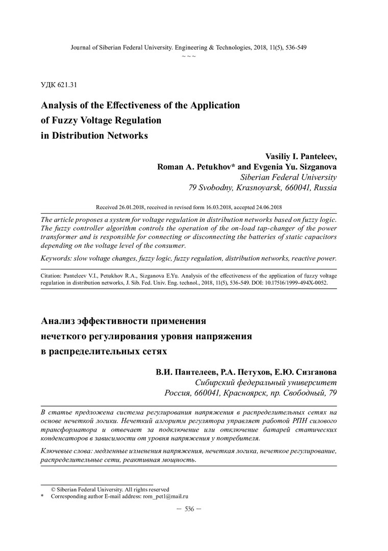 Библиографическое описание:Пантелеев, В. И. Анализ эффективности применения нечеткого регулирования уровня напряжения в распределительных сетях = Analysis of the Effectiveness of the Application of Fuzzy Voltage Regulation in Distribution Networks / В. И. Пантелеев, Р. А. Петухов, Е. Ю. Сизганова. - Текст : непосредственный // Журнал Сибирского федерального университета. Техника и технологии. - 2018. - Т. 11, № 5. - С. 536-549 : рис. - Библиогр.: с. 549. - ISSN 1999-494X.