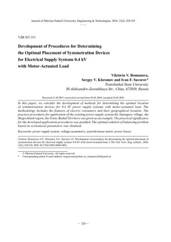 Библиографическое описание:Romanova, Viktoria. Development of Procedures for Determining the Optimal Placement of Symmetration Devices for Electrical Supply Systems 0.4 kV with Motor-Actuated Load = Разработка методики определения оптимального размещения устройств симметрирования для систем электроснабжения 0,4 кВт с электродвигательной нагрузкой / V. V. Romanova, S. V. Khromov, I. F. Suvorov. - Текст : непосредственный // Журнал Сибирского федерального университета. Техника и технологии. - 2018. - Т. 11, № 5. - С. 528-535 : рис. - Библиогр.: с. 535. - ISSN 1999-494X.