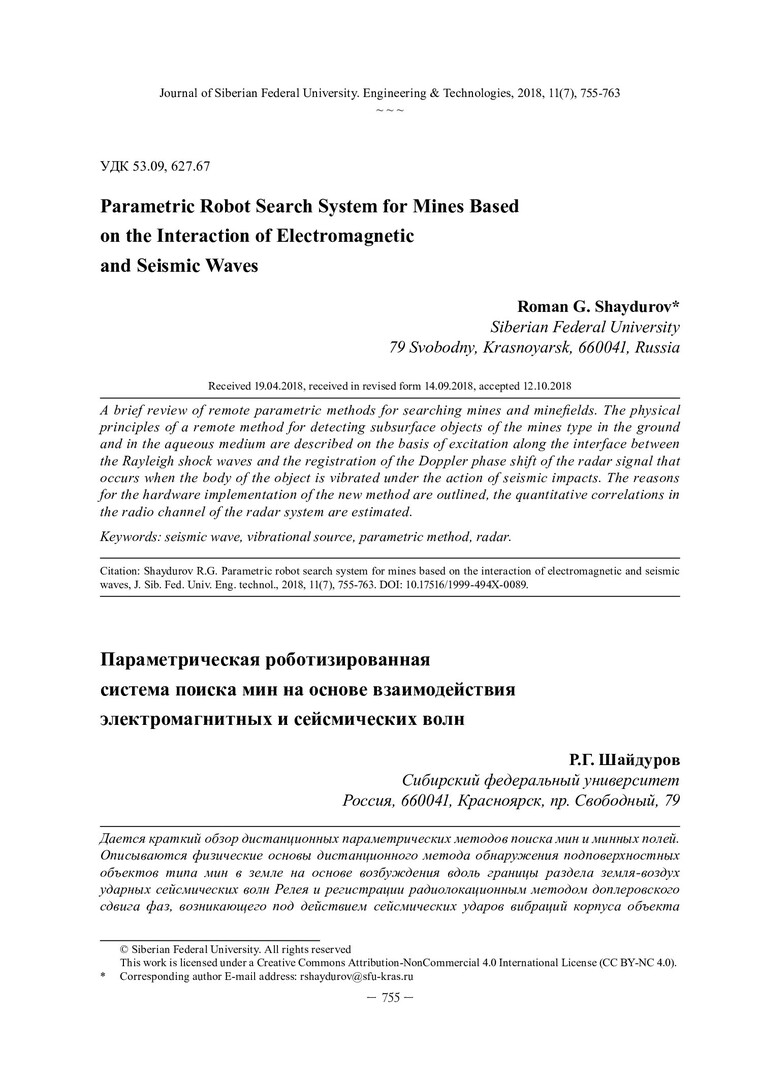 Библиографическое описание:Шайдуров, Р. Г. Параметрическая роботизированная система поиска мин на основе взаимодействия электромагнитных и сейсмических волн = Parametric Robot Search System for Mines Based on the Interaction of Electromagnetic and Seismic Waves / Р. Г. Шайдуров. - Текст : непосредственный // Журнал Сибирского федерального университета. Техника и технологии. - 2018. - Т. 11, № 7. - С. 755-763 : рис. - Библиогр.: с. 763. - ISSN 1999-494X.