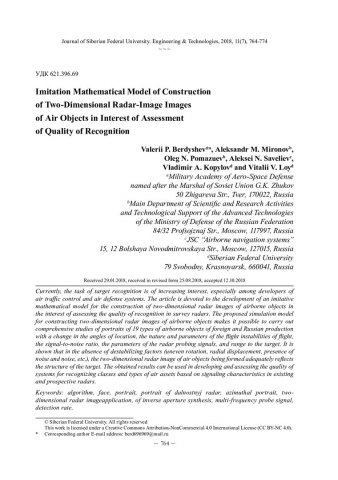 Библиографическое описание:Имитационная математическая модель построения двумерных радиолокационных изображений воздушных объектов в интересах оценки качества распознавания = Imitation Mathematical Model of Construction of Two-Dimensional Radar-Image Images of Air Objects in Interest of Assessment of Quality of Recognition / В. П. Бердышев [и др.]. - Текст : непосредственный // Журнал Сибирского федерального университета. Техника и технологии. - 2018. - Т. 11, № 7. - С. 764-774 : рис. - Библиогр.: с. 773-774. - ISSN 1999-494X.