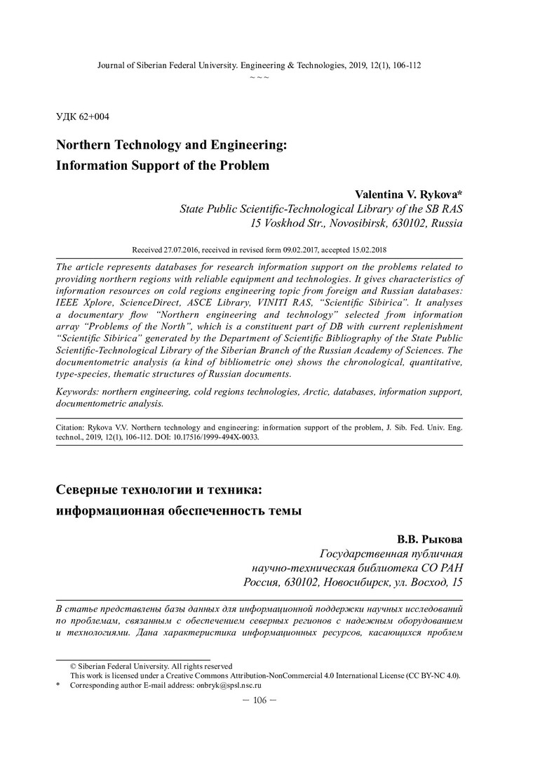 Northern Technology and Engineering: Information Support of the Problemстатья из журнала
