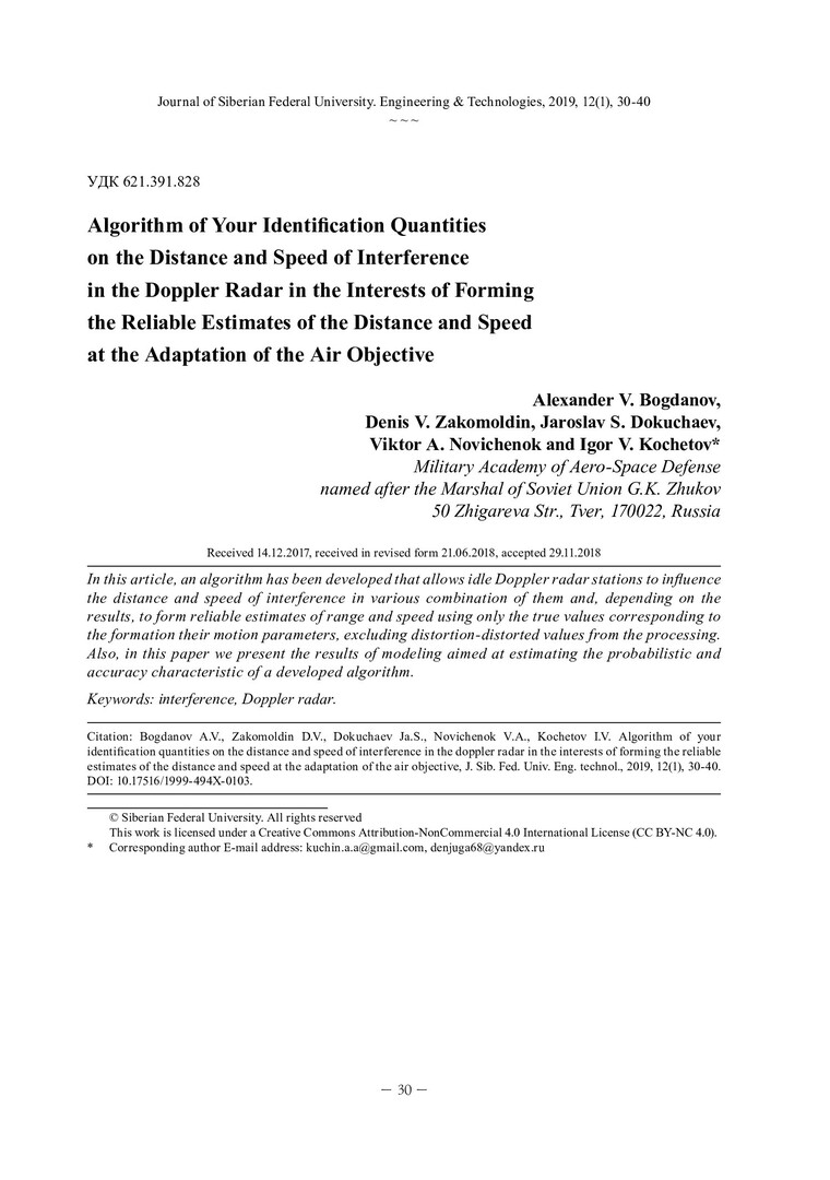 Аннотация:В статье разработан алгоритм, позволяющий идентифицировать в импульсно-доплеровских радиолокационных станциях воздействие уводящих по дальности и скорости помех в различных их сочетаниях и в зависимости от результатов идентификации формировать достоверные оценки дальности и скорости, используя только истинные значения соответствующих параметров движения, исключая из обработки искаженные помехой значения. Приведены результаты моделирования, направленные на оценку вероятностных и точностных характеристик разработанного алгоритма.