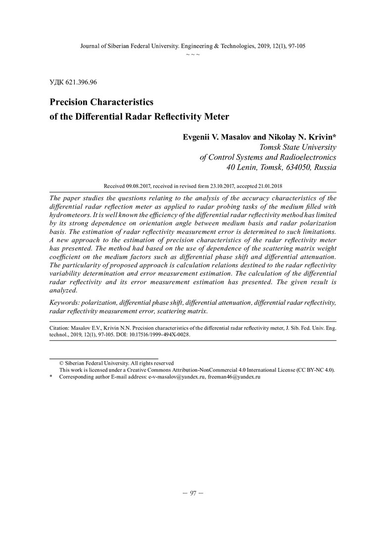 Аннотация:В работе рассмотрены вопросы, связанные с анализом точностных характеристик радиолокационного измерителя дифференциальной радиолокационной отражаемости применительно к задачам радиолокационного зондирования среды, заполненной гидрометеорами.