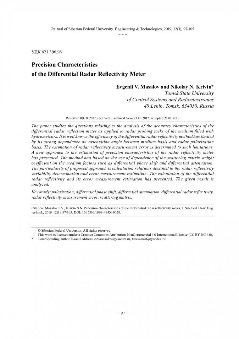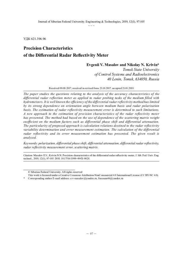 Библиографическое описание:Масалов, Е. В. Точностные характеристики радиолокационного измерителя дифференциальной радиолокационной отражаемости = Precision Characteristics of the Differential Radar Reflectivity Meter / Е. В. Масалов, Н. Н. Кривин. - Текст : непосредственный // Журнал Сибирского федерального университета. Техника и технологии. - 2019. - Т. 12, № 1. - С. 97-105 : рис. - Библиогр.: с. 104-105. - ISSN 1999-494X.